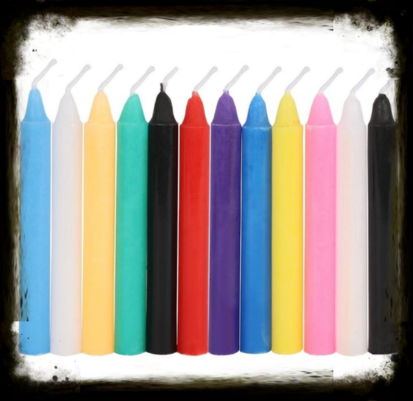 Box of 12 mixed spell candles containing these colours; 2x black, 2x white, 1x purple, 1x dark blue, 1x light blue, 1x orange, 1x green, 1x red, 1x yellow and 1x pink candle.