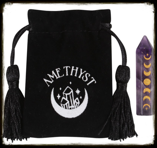 This beautiful amethyst crystal point is perfect in size for travel altars, desk decor or taking on the go for extra protection. Features a gold-tone moon phase engraving and comes with a matching drawstring bag for storage and safe-keeping.